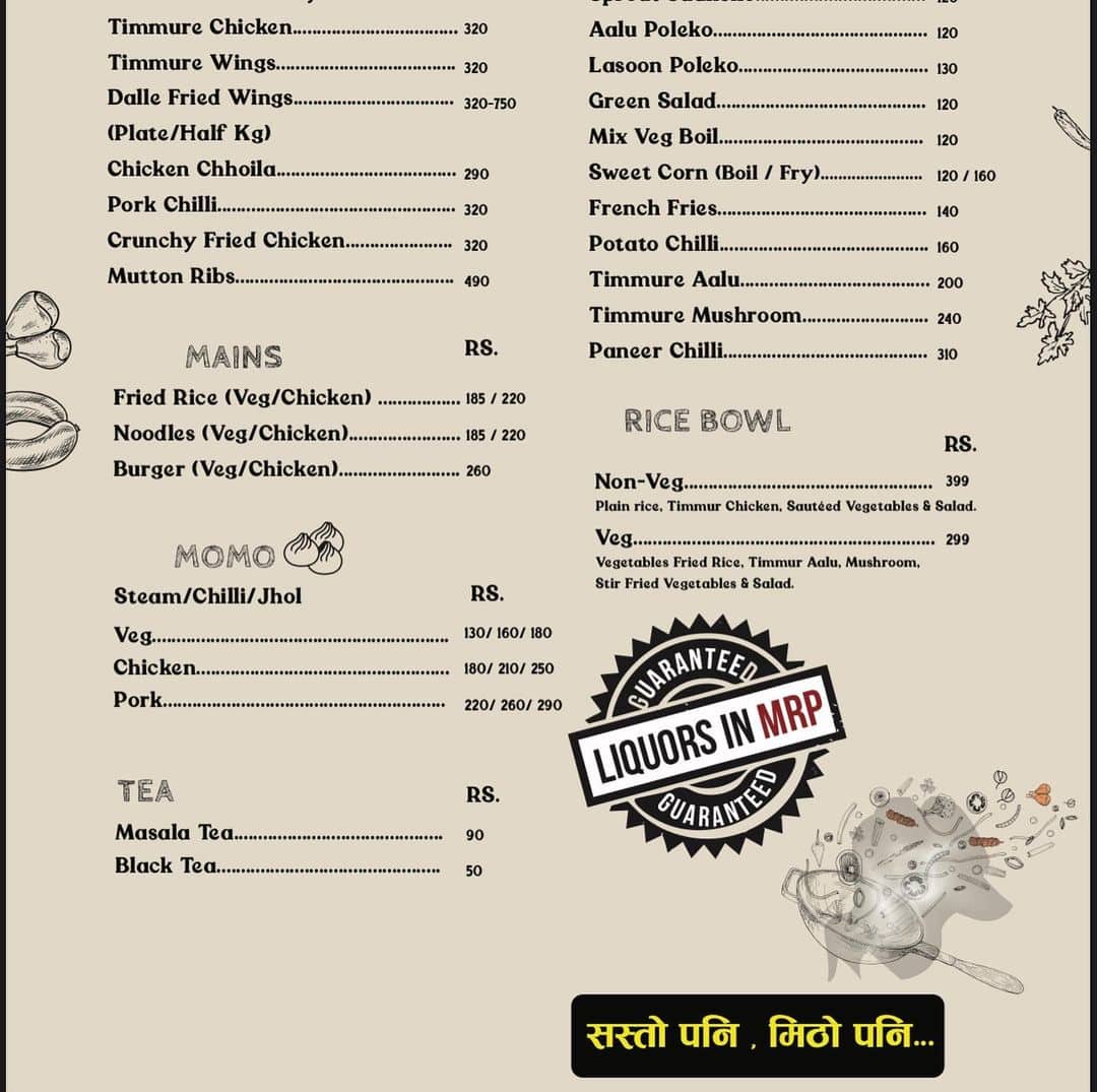Timmure, named after Nepal’s most popular spice, is known for its amazing sekuwa and timur-based dishes. Some of the highly recommended dishes at Timmure include mutton sekuwas, mutton ribs, chicken chili, wings, bhuja chatpate, timmur chicken, timmur mushroom, and spicy chicken.